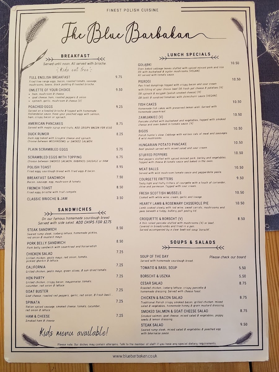 The Blue Barbakan Menu showcases an impressive array of dishes, each carefully crafted to deliver a harmonious mix of flavors. From hearty stews to delicate dumplings, the menu draws inspiration from countries such as Poland, Hungary, and Ukraine, offering a variety of options to suit every palate. A standout dish is the classic Bigos, a flavorful hunter's stew made with sauerkraut and a combination of meats, offering a comforting yet bold taste. For those seeking something lighter, the Pierogi, traditional Polish dumplings stuffed with a variety of fillings, such as potato and cheese or meat, are a crowd favorite, perfectly crispy on the outside and soft on the inside.